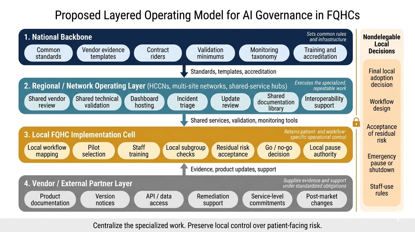 That would mean shifting some of the specialized work away from each individual clinic and into shared support structures: common vendor review, shared validation support, common monitoring frameworks, standard documentation, and reusable governance tools.