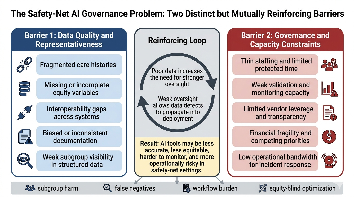 In practice, those same settings expose a problem that the broader AI conversation often skips over: safe deployment depends on both good data and strong governance, and safety-net clinics often have the least access to both.